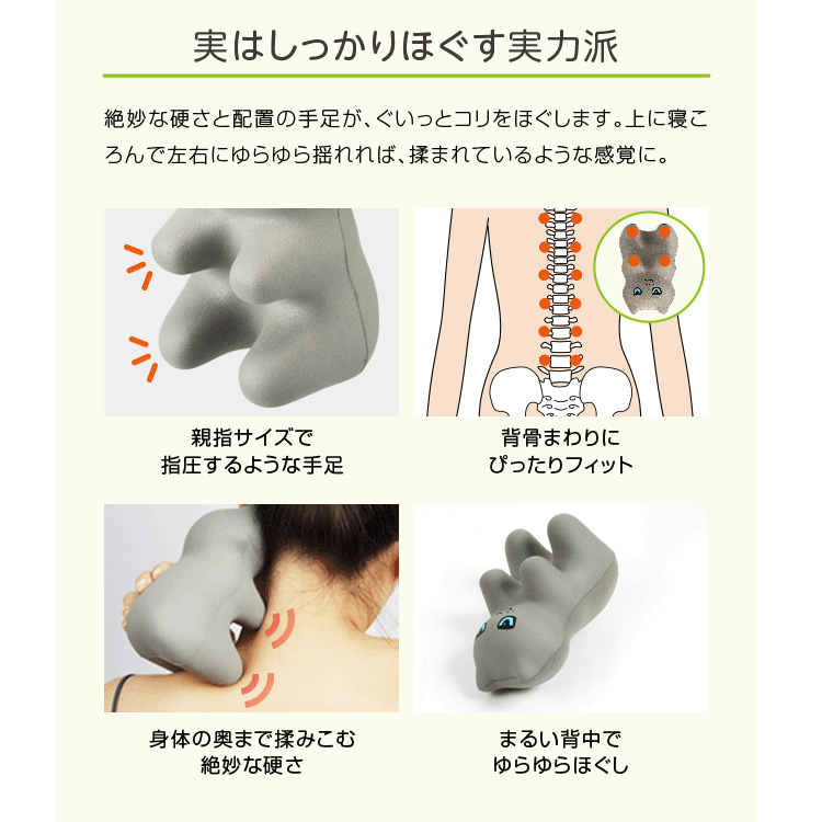 ただの猫グッズではありません。ゆる~い癒し系の見た目とは裏腹に、疲れたカラダの様々な部位の“こり”をしっかりとほぐしてくれる実力派の指圧代用器。