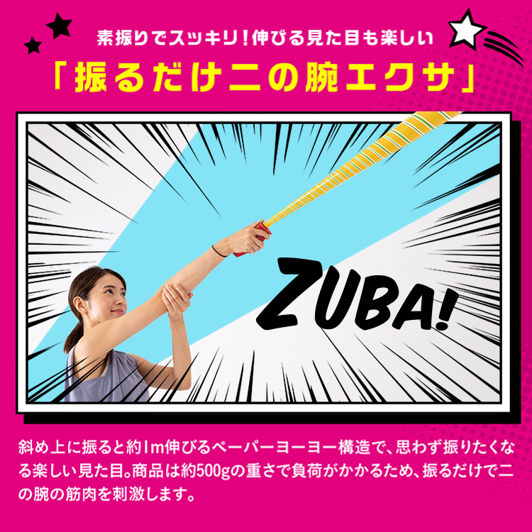 昔懐かしのペーパーヨーヨーにヒントを得て、エクササイズグッズに進化させた「ズバット」。約500gの重さで負荷がかかり、振るだけで二の腕の筋肉を刺激します。