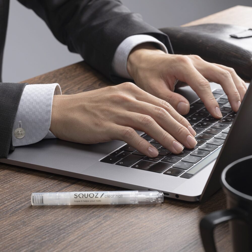ネイルケアが初めての男性でも簡単に塗れる、ノック式のペンタイプ。カチカチと押して筆先から液を出して、爪に塗布。わずか40秒で乾いて、フィルムのような被膜を形成します。割れ爪や縦筋が入った爪に美容液が入って固まることで、爪をキレイにコーティングして保護します。